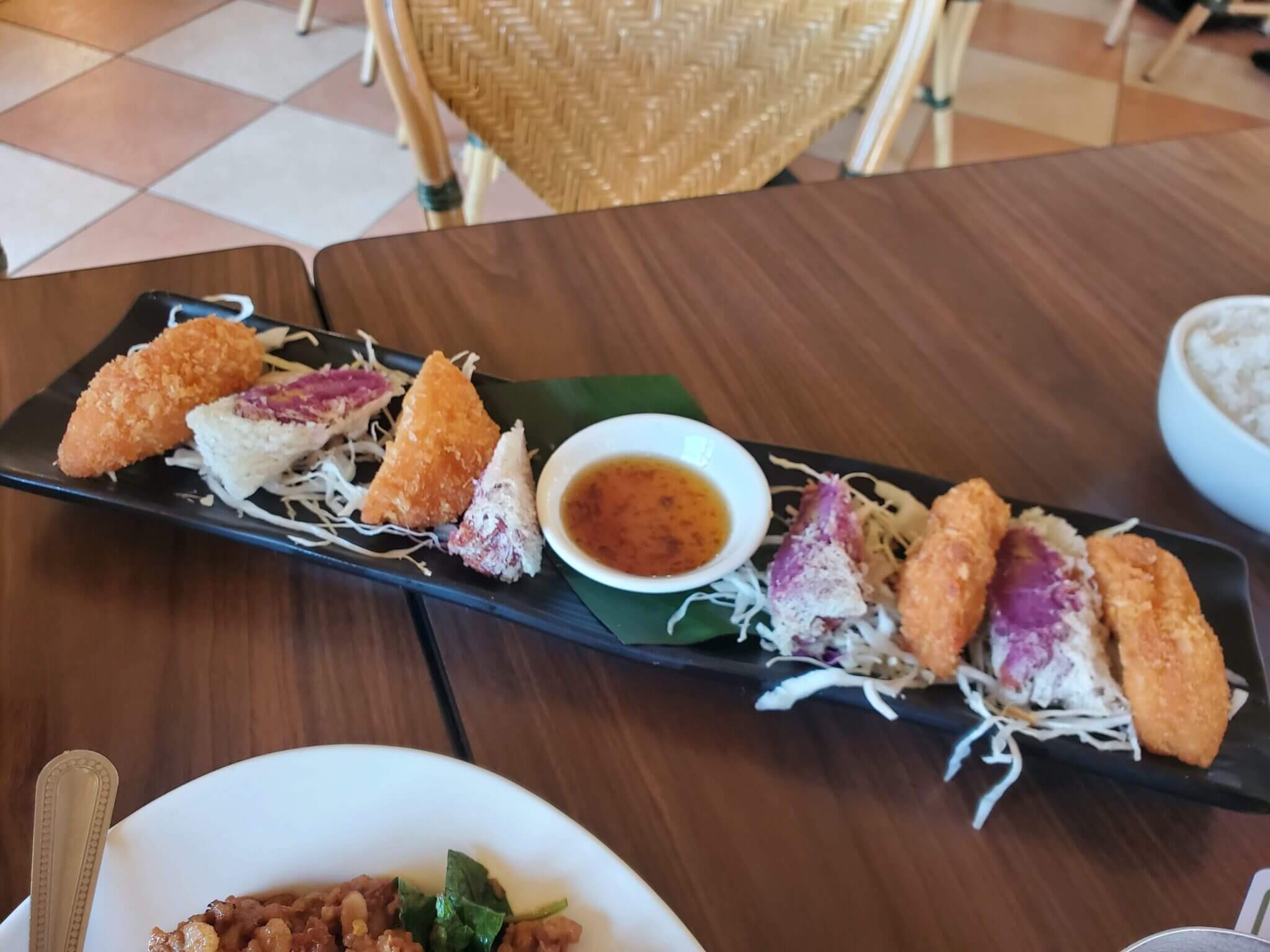 雖然是寫說2~3人份套餐,但是我們當天3大1小吃得很飽還差點吃不完,整體上餐點沒有什麼太大的雷點中規中矩,餐點口味比較偏向於台式口味,最有印象的是那道紫色的蝦餅,吃起來微微的甜,是所有餐點中,得到我們一致好評的