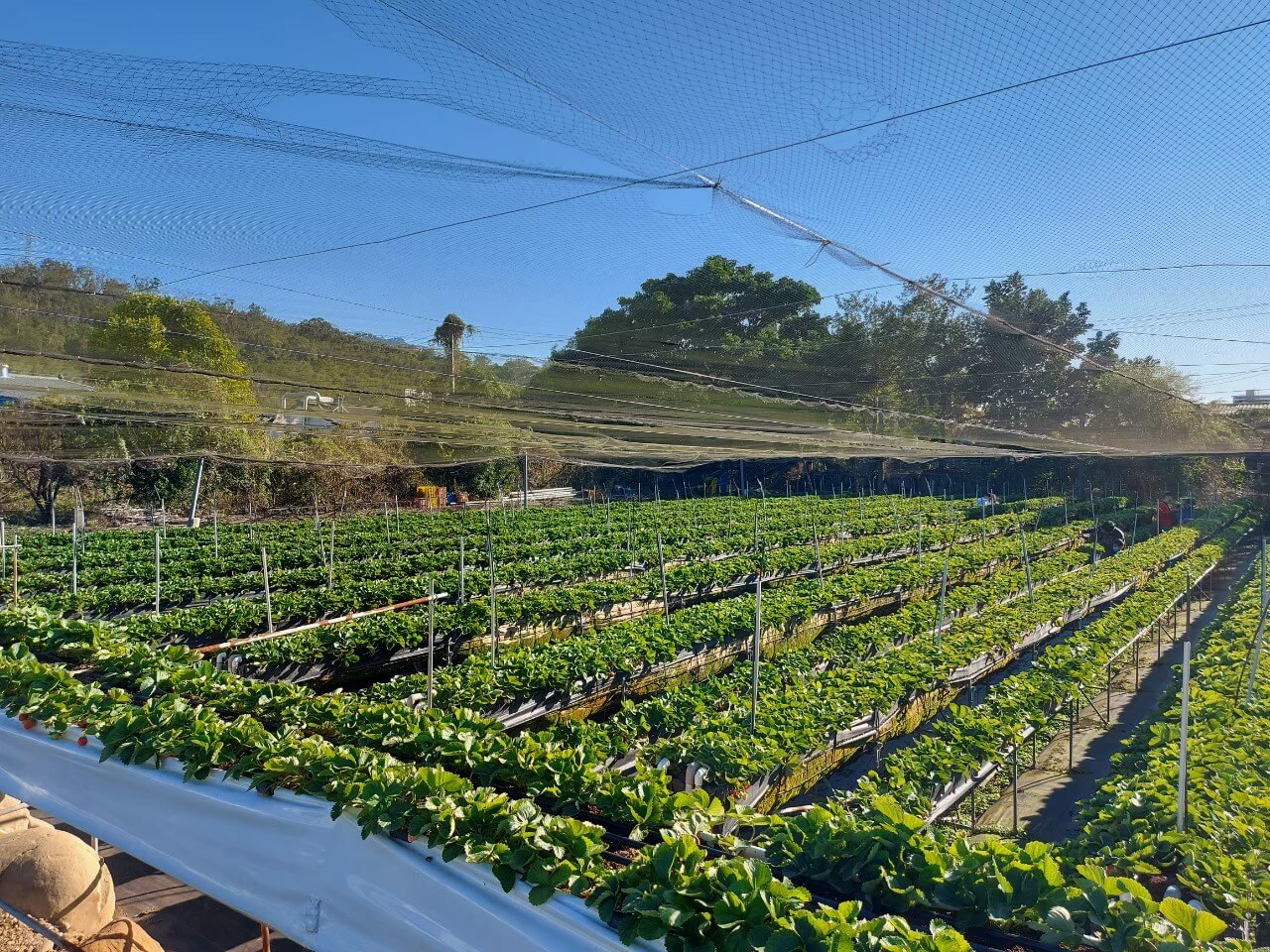 苗栗景點 六合高架草莓農場的草莓園佔地滿廣的,整片的草莓都是高架式栽種的,高度剛好在一個成人的腰部,只需要稍微彎腰就可以採摘草莓