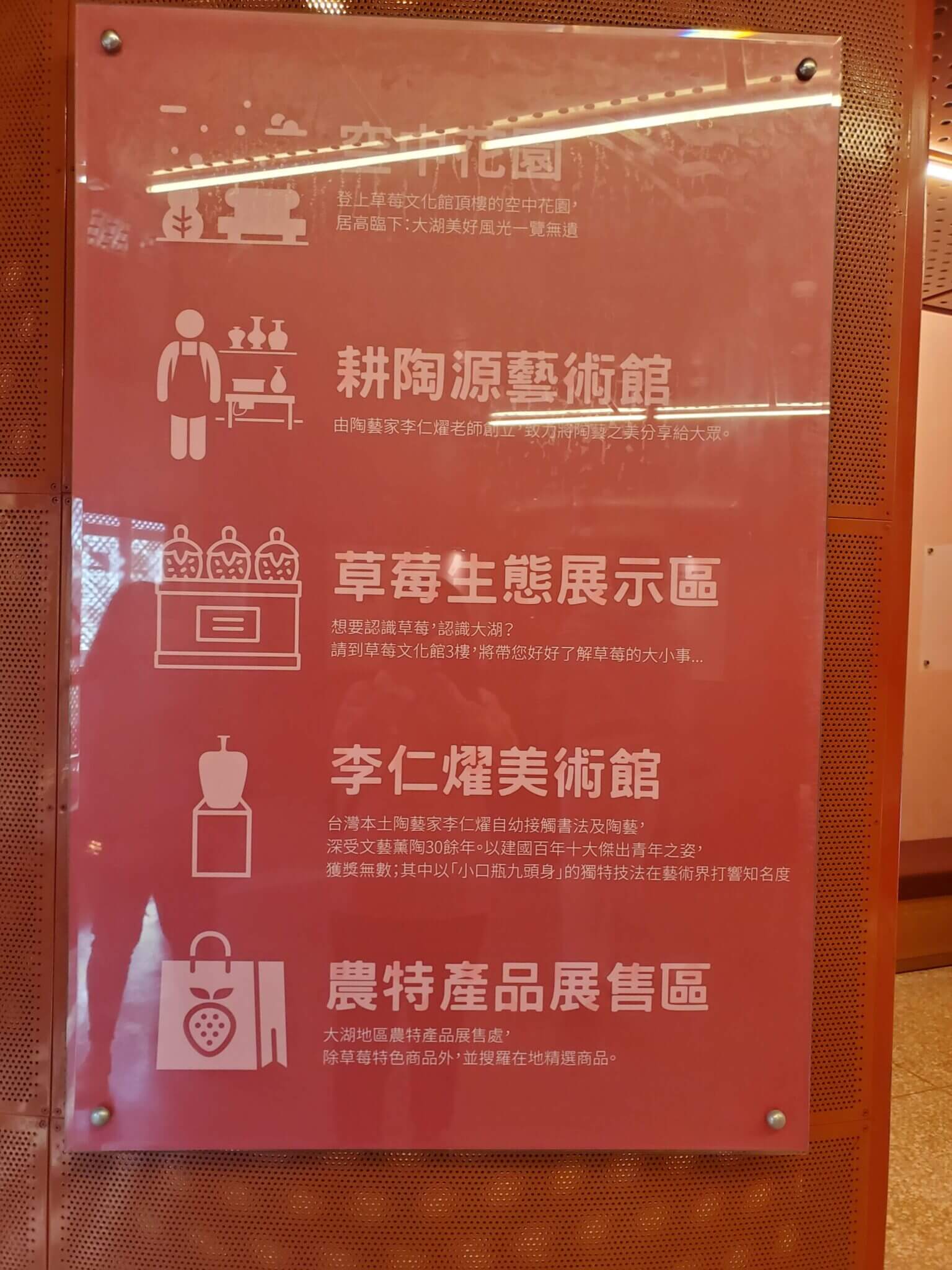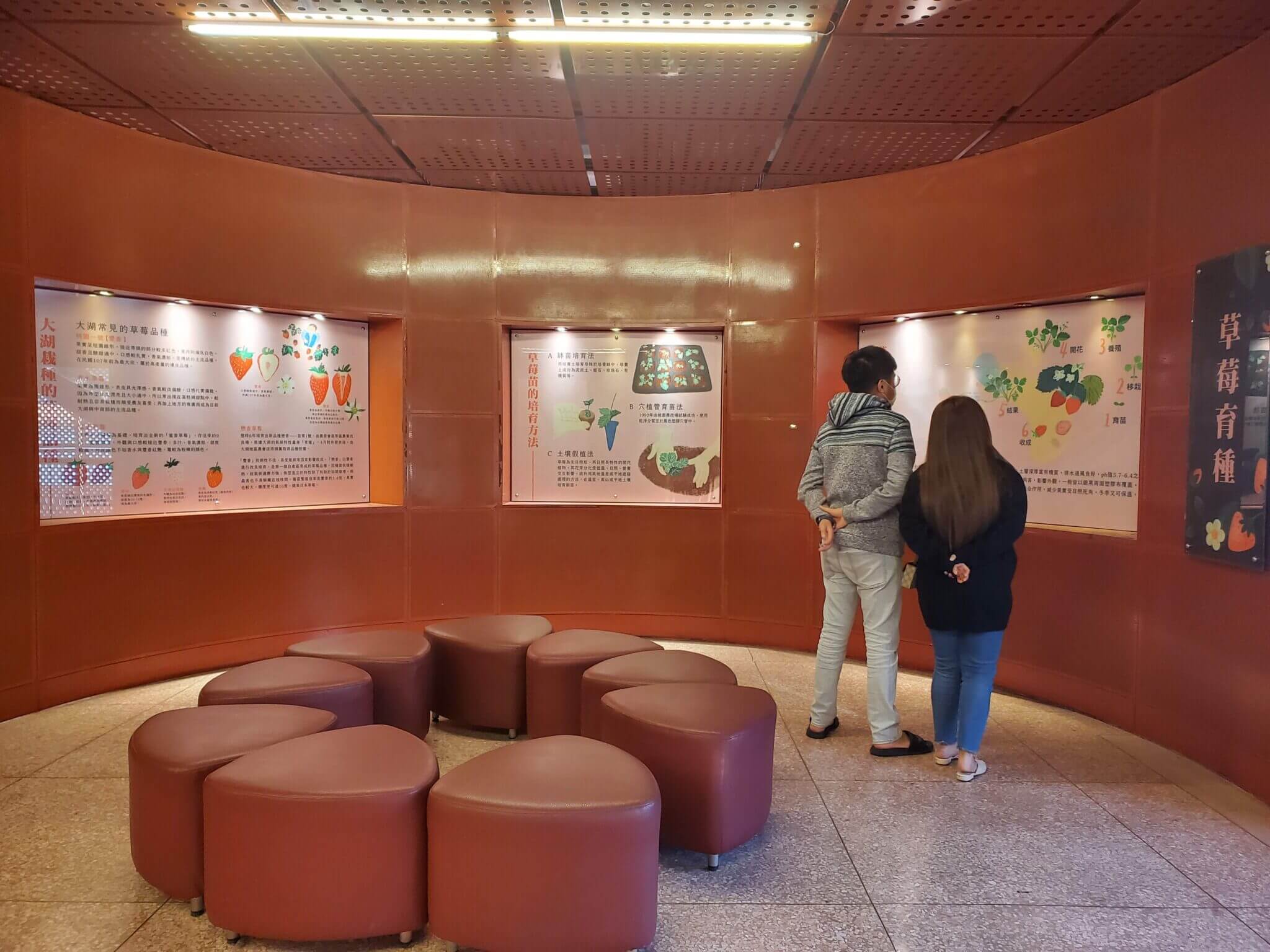 繞了一圈之後,我們趕緊往苗栗景點 大湖酒莊的草莓文化館樓上參觀,裡面的二樓和四樓分別都是藝術展覽,參觀不需要門票,三樓則是介紹苗栗大湖特產-草莓,除了介紹草莓的栽種以外,還有介紹簡易的草莓食譜,不過裡面的坪數都不大,繞個一圈大約10分鐘就結束了