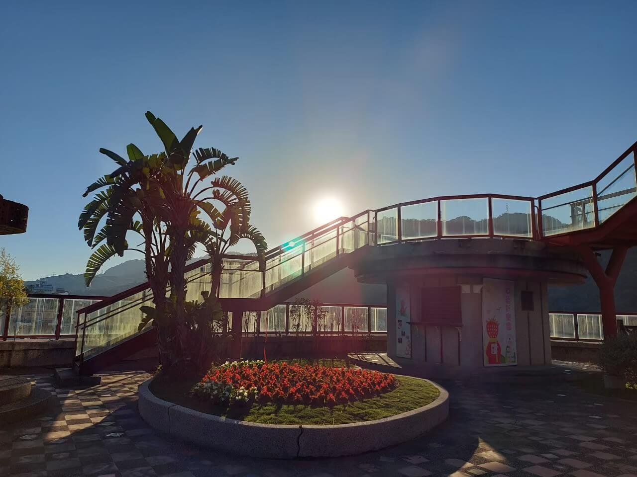 在圓形建築裡,五樓則是打造成空中花園,這裡算是附近的最高點,來到頂樓可以俯瞰苗栗大湖的風光,不過有點可惜的是,空中花園看起來有點荒廢,雜草叢生除了視野還不錯以外,似乎就沒比較特別的地方了