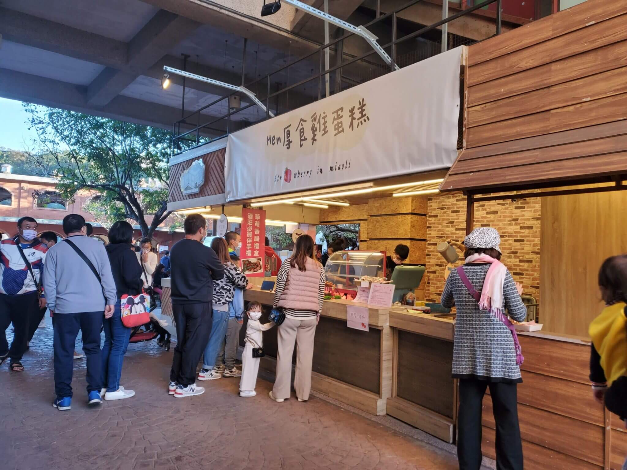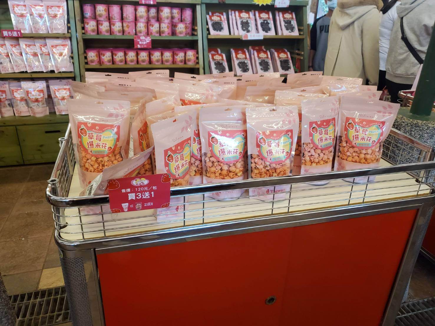 我們回到苗栗景點 大湖酒莊一樓的地方,往圓形建築後方走,這裡是一個小廣場,販賣了很多草莓周邊產品,有草莓貢丸、草莓冰淇淋、草莓氣泡飲和草莓爆米花等等,能夠在這邊買點小東西吃
