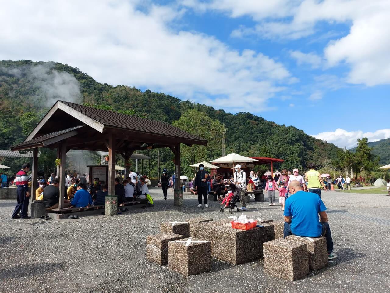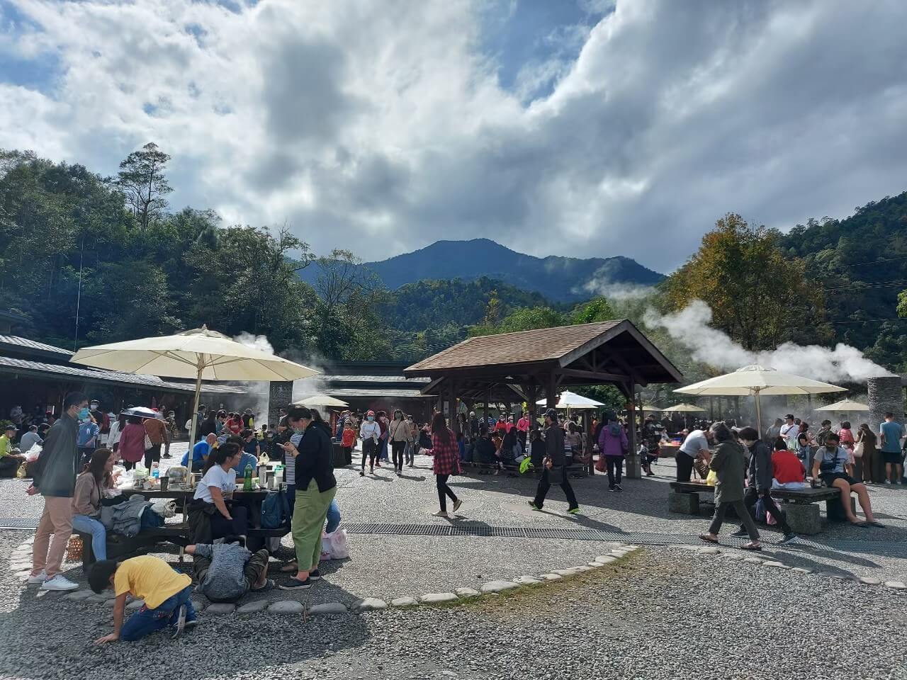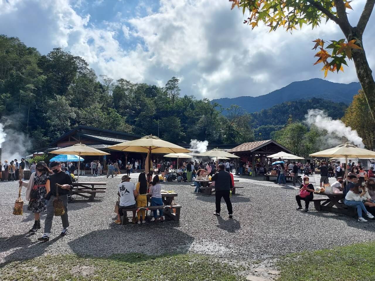 在湯屋旁邊就是宜蘭景點 清水地熱的重點區域,可以看到人潮滿滿,宜蘭景點 清水地熱設立了不少座位區,座位區間的寬度很大,是讓人很舒服的空間,不過我們當天要找座位區也是很難找,幾乎都坐滿了,建議先找到座位以後再去購買要煮的食材,才不會有沒位置坐的窘境
