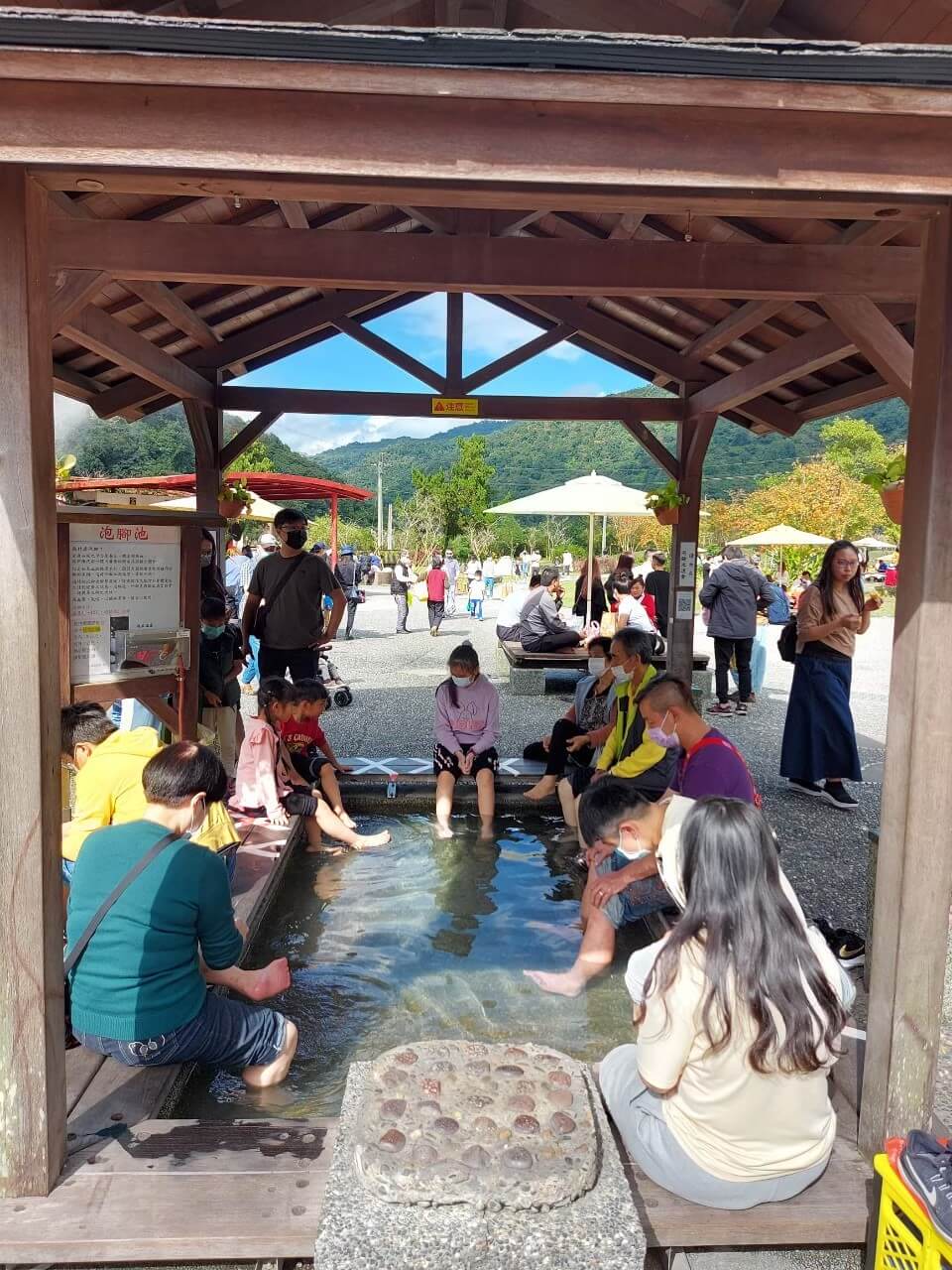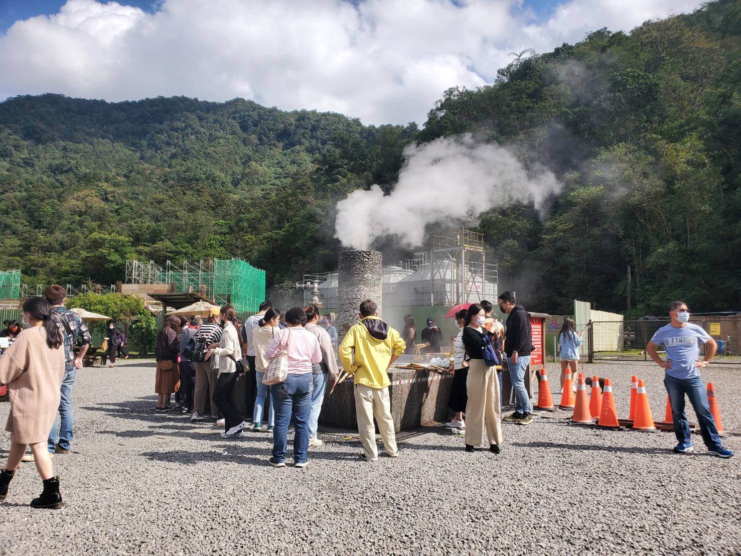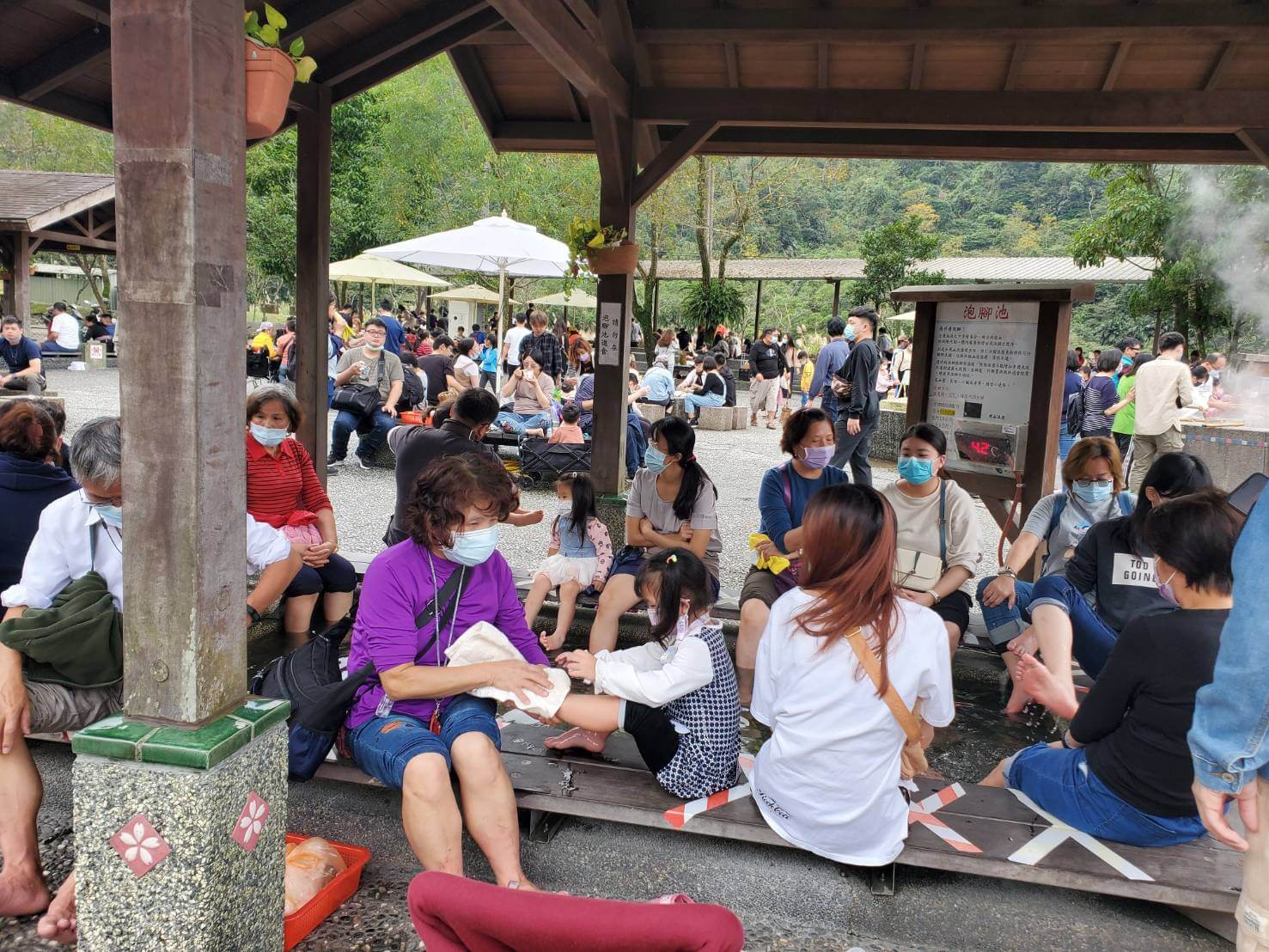 在湯屋旁邊就是宜蘭景點 清水地熱的重點區域,可以看到人潮滿滿,宜蘭景點 清水地熱設立了不少座位區,座位區間的寬度很大,是讓人很舒服的空間,不過我們當天要找座位區也是很難找,幾乎都坐滿了,建議先找到座位以後再去購買要煮的食材,才不會有沒位置坐的窘境