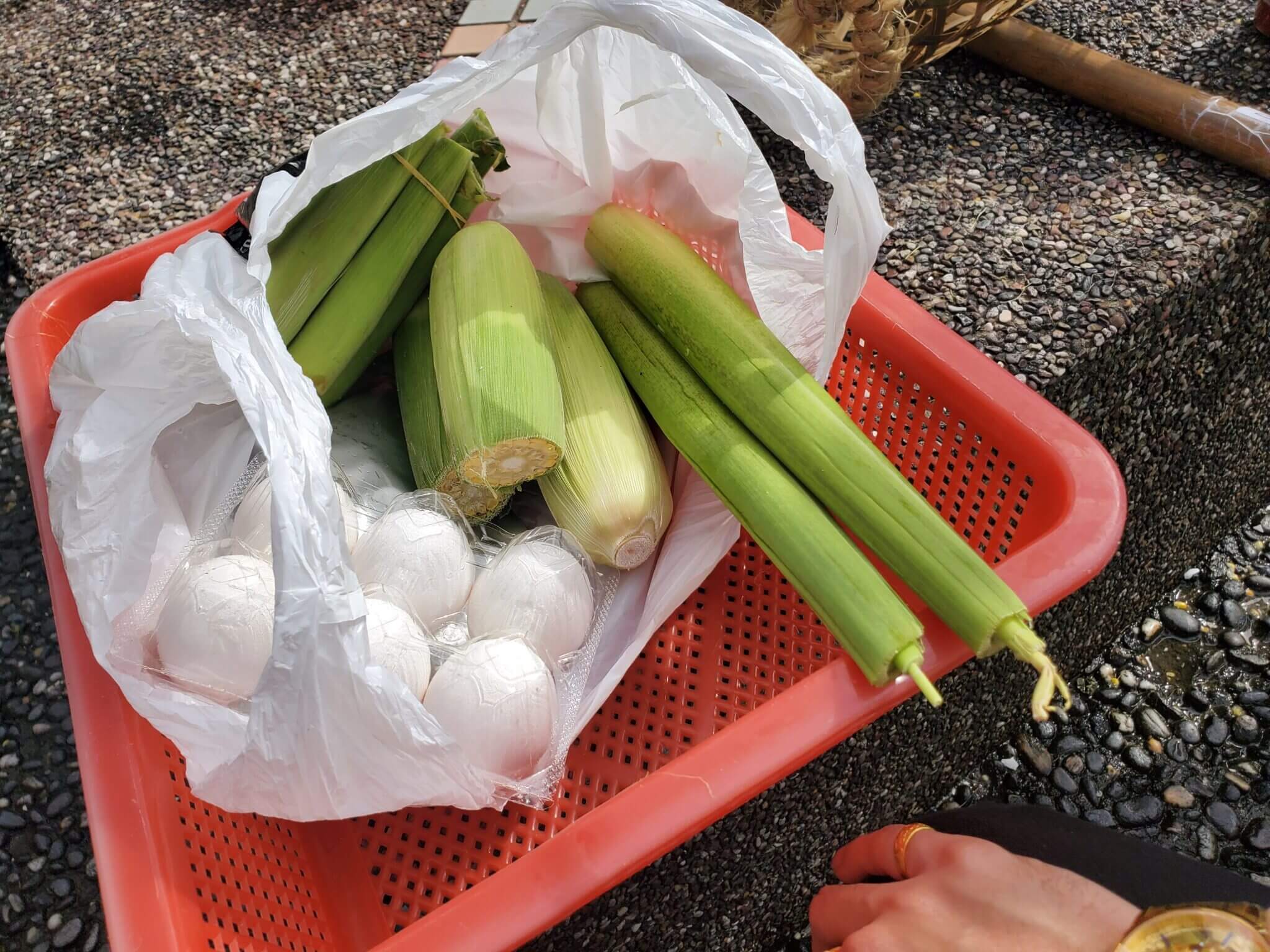 我們當天是購買300元的套餐,裡面有玉米、雞蛋、茭白筍和花生,份量其實蠻多的,但是我們總共5大2小,吃完就像在吃點心一樣,要吃飽可能要多買或是自己帶食材