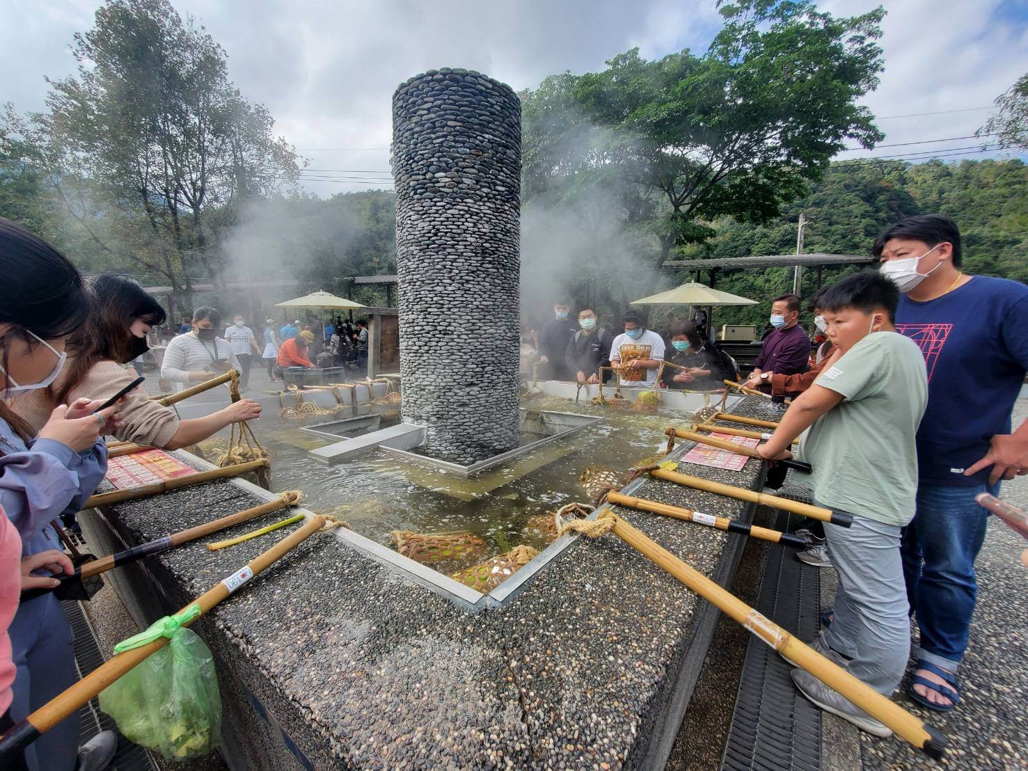 將食材裝進竹簍裡以後,就是到地熱區煮我們這些食材了,不過宜蘭景點 清水地熱可以煮的地方只有兩區,以這裡的人潮來講稍嫌不足,大家都擠在一起