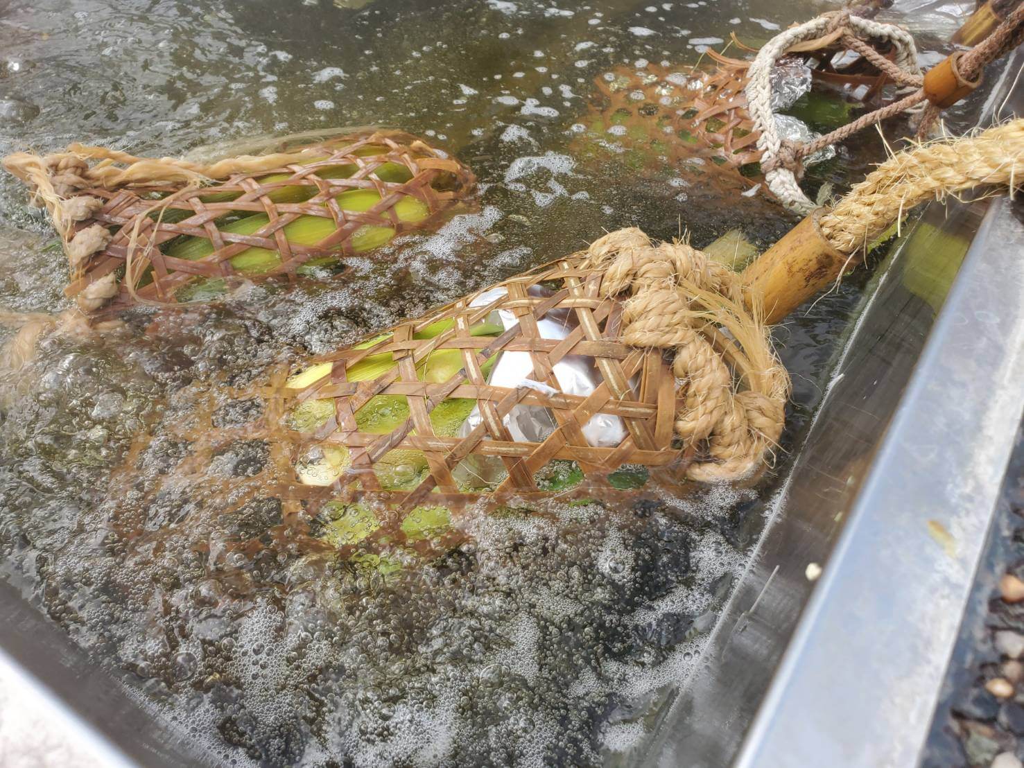 當天有不少人是記得自己竹簍的編號就先到一旁的座位區休息,等時間到了再來拿取自己的竹簍,不過這樣有兩個缺點是,有時候竹簍會被後來的人移動位置導致食材掉出,再加上有時候可能蛋煮破了或是食材爆開沒辦法第一時間解決,就看大家來到這裡怎麼取捨了